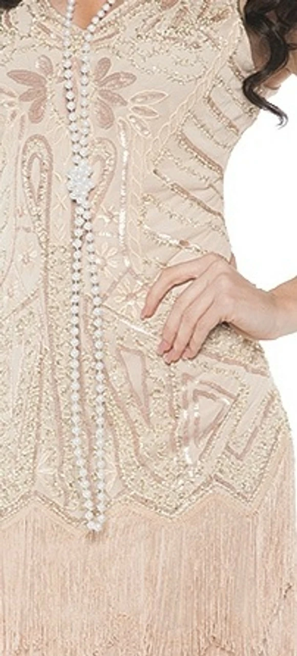 Go back to a time where dazzling dances, beaded dresses, and ornate cigarette holders were everywhere! This absolutely stunning 1920 Rose Flapper Dress will make you feel like you’re in The Great Gatsby, Bugsy Malone, or the musical Chicago. The dress is fully beaded (front and back) and intricately decorated, with a fringe trim. Pair this luxurious 1920s dress with a feather headband and an elegant cigarette holder to truly look and feel like a flapper girl.
