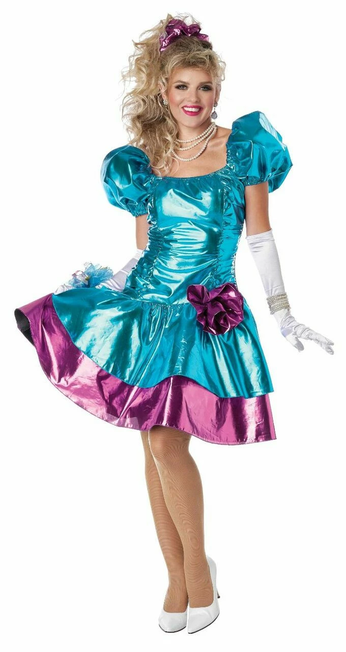 We are totally in LOVE with this 80’s Party Dress Costume. The 80’s, an eclectic decade in fashion, is known for its bold style, colors, and silhouettes, and lavishly permed hair. Just dress it up in this shiny aqua blue ruffled party dress, square neck, puffed sleeves, adorned with a magenta flower, matching the magenta underskirt. Add the big curled hair and some white glove and you are ready to party!