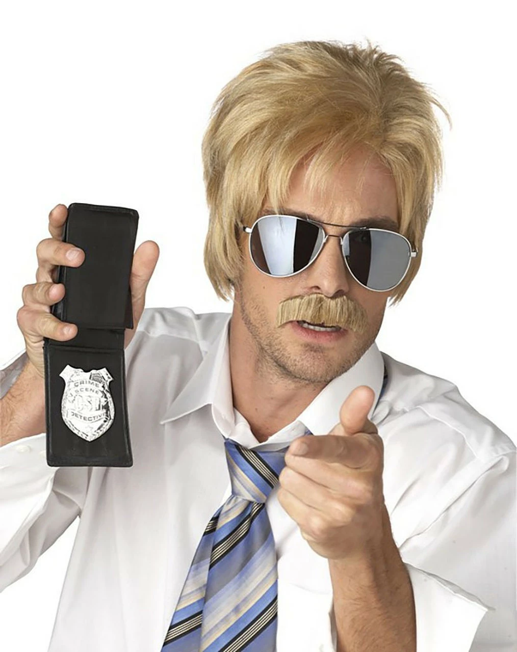 The Ace Detective Blonde Wig includes the Mustache too. Perfect accessory for a Reno 911 Costume, a Detective Costume or a Retro Disco Costume!