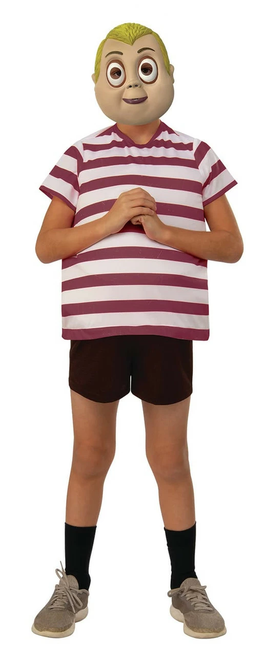 Become part of the Addams family with this Pugsley Addams Child Costume! This officially licensed costume features a striped red and white shirt with an attached belly, black shorts, and a Pugsley Addams mask. This classic Halloween costume is sure to be a hit. Make sure to get your friends to wear Addams family costumes, too!