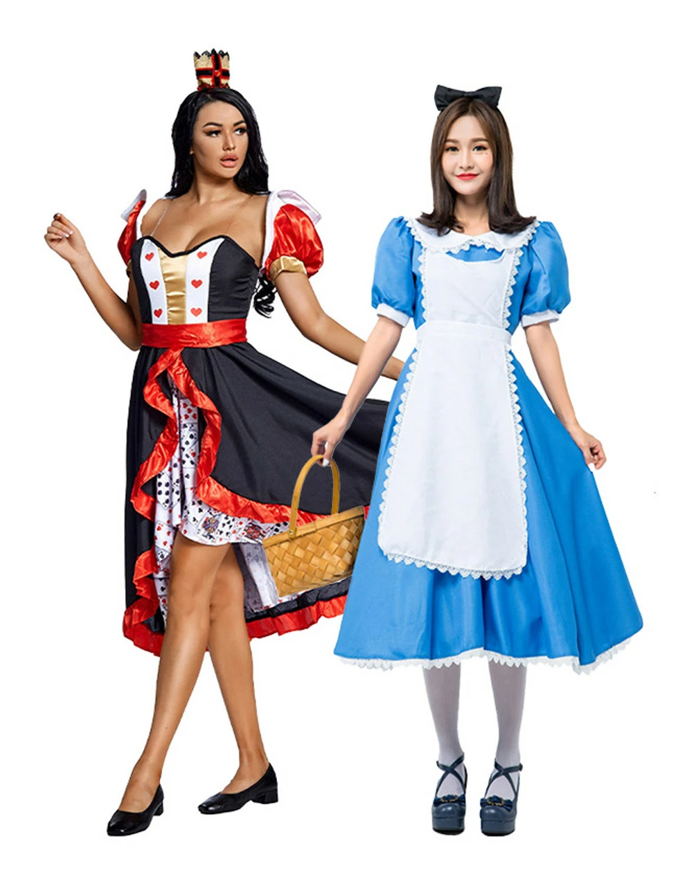Be the queen of the party in this femme fatale take on the classic villainess from Alice in Wonderland. This Queen of Hearts Women Deluxe Costume features a gold black and white corset top with red heart prints, red satin puffed sleeves and white collar. The black skirt has a red satin ruffle hem and a front slit to reveal playing-card print underskirt and a red satin waist sash.