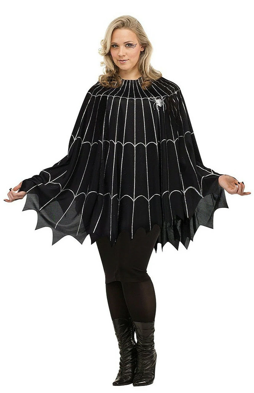 This Plus Size Black Silver Spiderweb poncho will be a fun accessory for your costume! It features a black poncho with a glitter spiderweb.