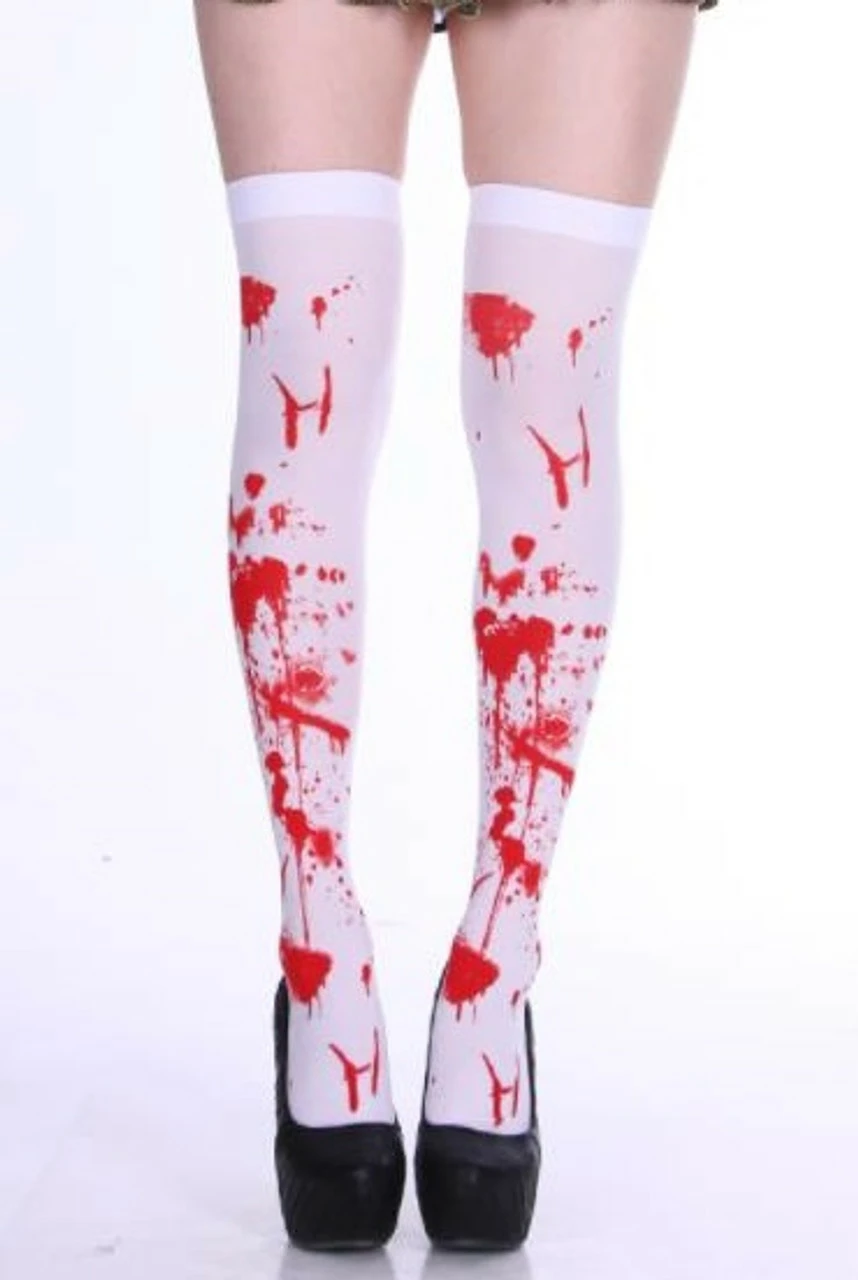 The Blood Spotted Thigh High Stocking are perfect for your next undead costume or to add a scary twist to any costume. These white stockings feature a red blood splatter design all over to complete your terrifying costume.