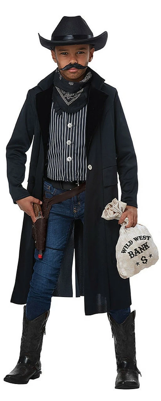 Which side of the law will your child be on? He can live adventures in the Far-west in this Sheriff Outlaw costume. Anything is allowed with the classic costume outlaw costume featuring a long, dark blue jacket with an attached striped blue-and-white vest, a black cowboy-style hat, a fake moustache, a dark blue bandana, and a money bag decorated with a dollar sign and a ÔWild West Bank’ inscription. Just don’t let the sheriff catch you! Thanks to a silvery badge, the outlaw outfit easily becomes a sheriff outfit
