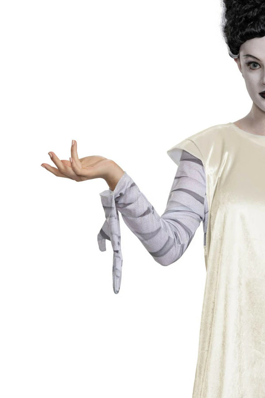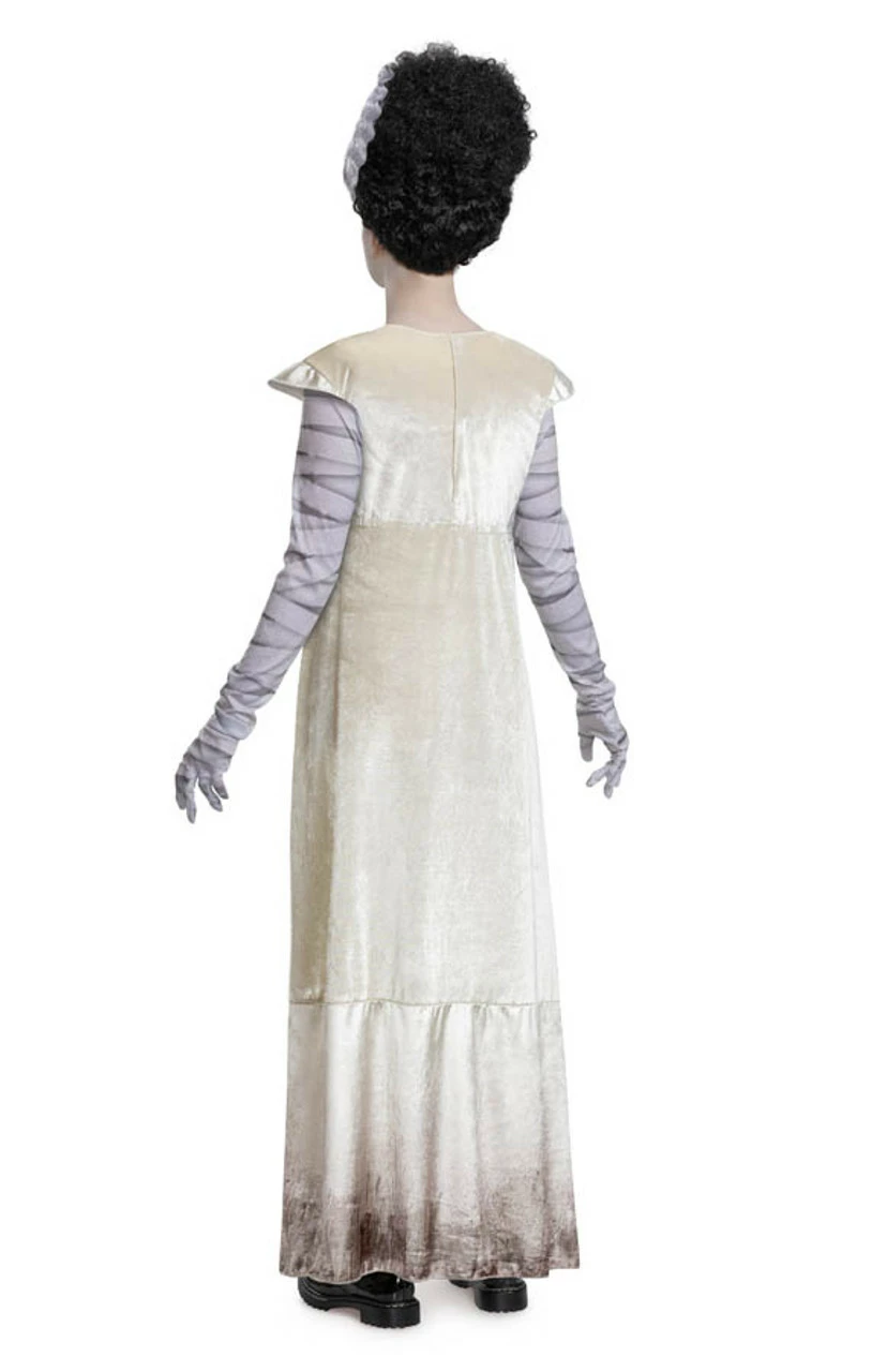 Why not be a stunning and spooky Universal Monster this Halloween! The Bride of Frankenstein Women Costume features a soft white dress with a darker trim on the bottom to give a rustic appearance. The long sleeves look like bandage wraps and have attached gloves that can easily be removed. The classic character wig that is black and white completes the look!