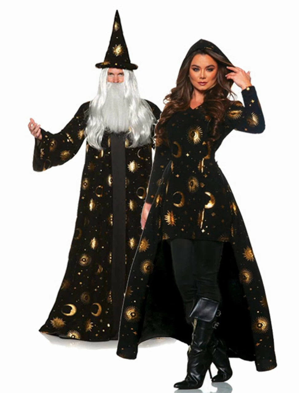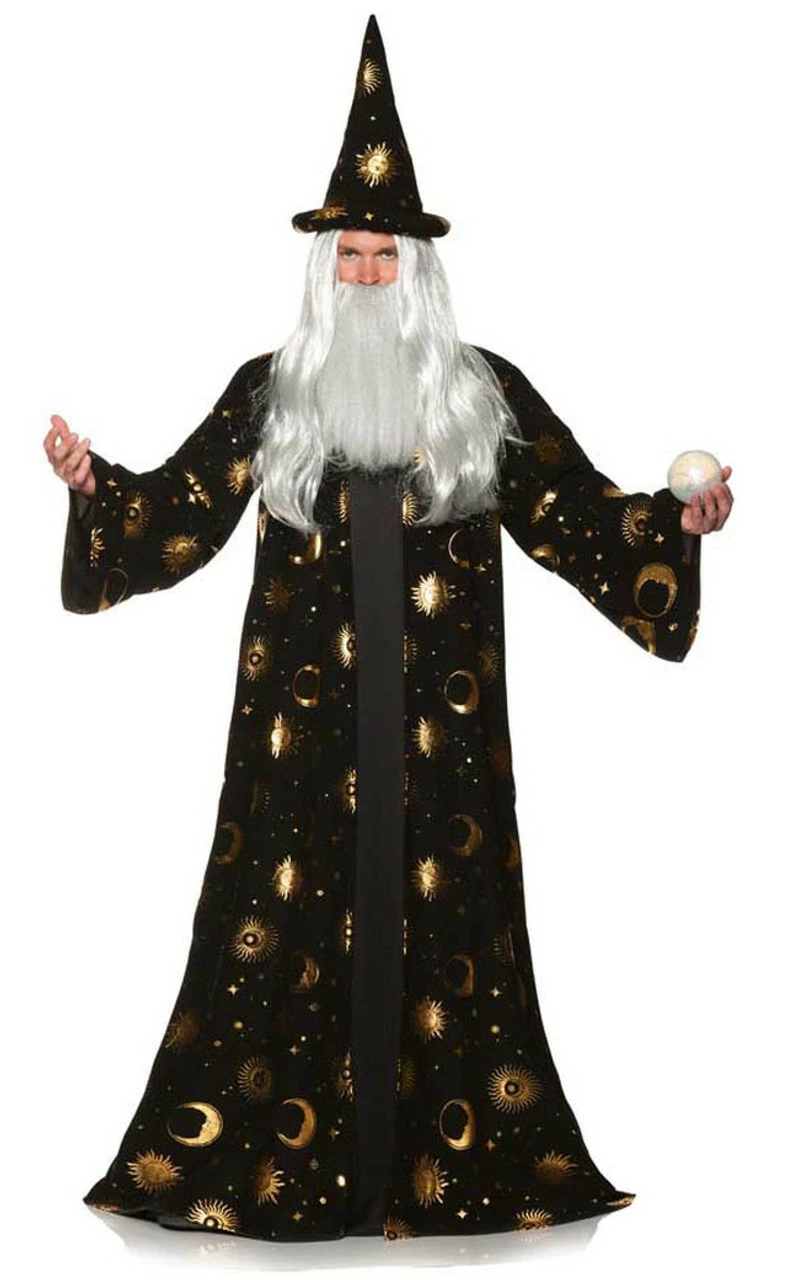 Cast spells and charm those around you this Halloween season in the Celestial Wizard Man Costume! This magical costume features a floor-length regal black tunic with gold sun and moon print and long-sleeves. It also comes with a matching pointed hat, so you can be the most enchanting person at the party and bewitch the night away!