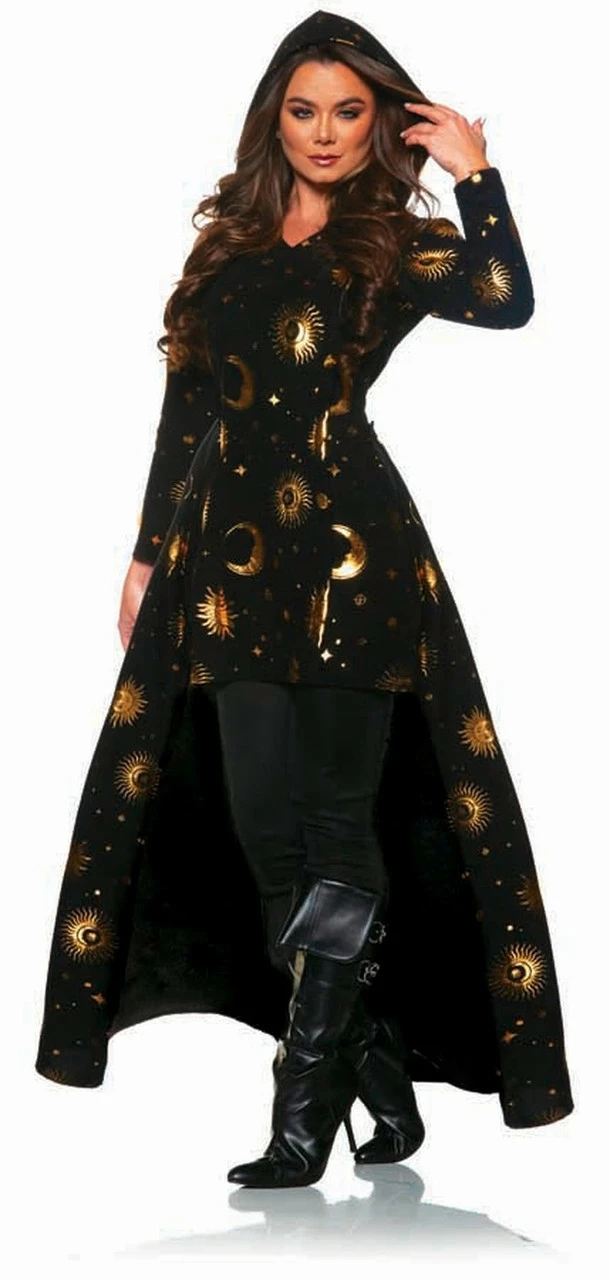 Charm the night away in this magical Black Celestial Magic Women Costume! This amazing item features a velvet tunic with gorgeous gold sun and moon print. The short tunic has an attached hood and a detachable train for you to feel free to customize your look. It also includes the leggings, so you can be sure to feel completely mystical as you cast spells all night long.
