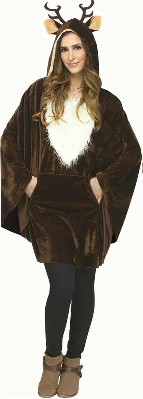 Be part of Rudolph’s gang this Christmas in this cozy Christmas Reindeer Plush Poncho! This comfortable ponchos features a brown body with a furry white belly and an attached hood with antlers. It also includes pockets in the front, so you can be the coziest possible in front of the fire this year!