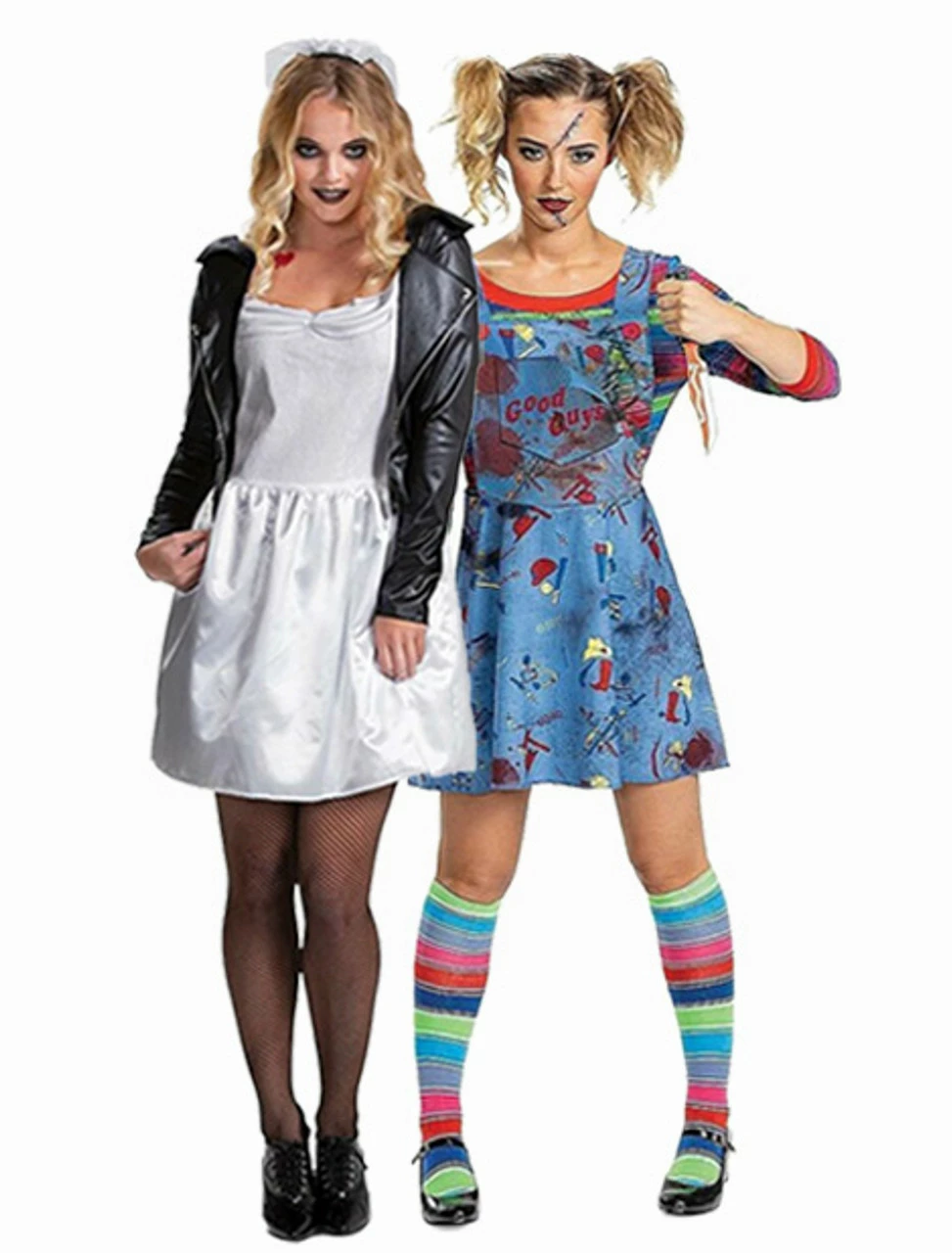 Turn into a psycho, but not any psycho! Dress up as Tiffany Valentine, the murderous doll in the Bride Of Chucky Deluxe Women Costume! The costume features a white short satin wedding dress and an attached leather jacket with glossy finish for the gothic look. The included veil has all over glitter. Just add the gothic make up, the bimbo hairstyle to this officially licensed costume and get ready to feed your killing addiction.