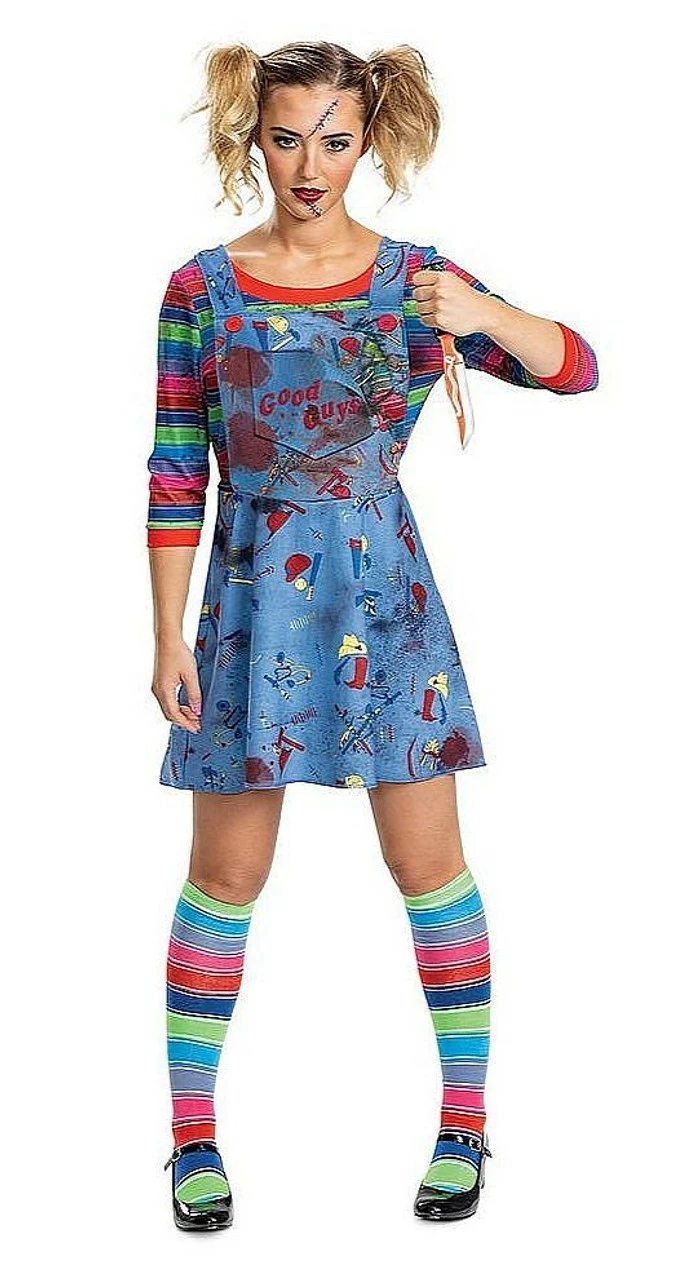Anyone can be the possessed doll Chucky! Become the Chucky doll you’ve always wanted to be with this Chucky Deluxe Women Costume. The dress features a pullover dress styled to look like overalls with striped mid length sleeved shirt. The Overall is blue with colored patterns all over it and the logo “Good Guys” in red on the front pocket. The matching pair of socks are also included with the costume. You’re ready now to go on a killer Halloween adventure!