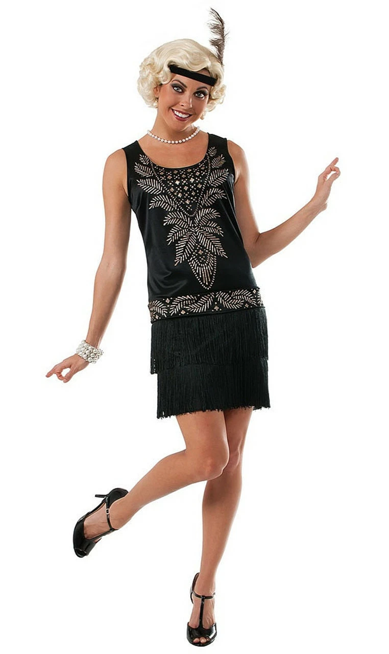 Put on Cocktail Flapper Women Costume and travel back to the 1920’s like in Midnight in Paris. This costume features a beautifully beaded dress with attached fringe skirt. The Cocktail Flapper Women is perfectly crowned with a black headband accentuated with feather. Add a 1920’s style jewelry to complete the look.