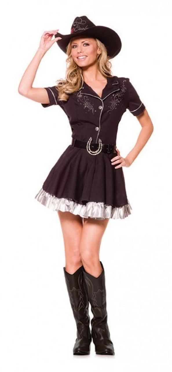 Giddy-up! Be prepared to be turn heads in the Wild West in this Cowgirl Rhinestone Woman Costume! It features a brown breasted dress with a white outline on the sleeves and collar, as well as rhinestone detail on the shoulder and buttons on the front. The skirt of the dress features a white petticoat, and the costume includes a black belt with a rhinestone horseshoe buckle and a matching cowboy hat with rhinestone detail. Yeehaw!