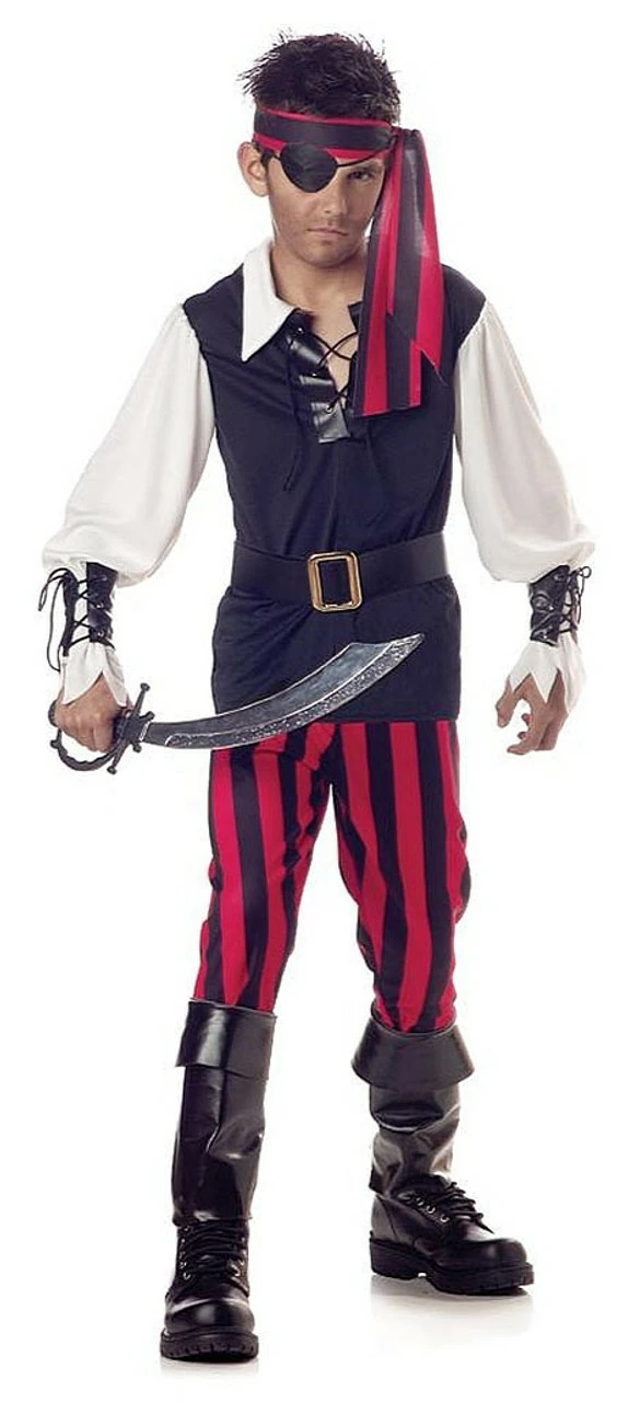 Where there is a sea, there are pirates. Get ready to sail your ship O Cutthroat Pirate, and call your crew. This Pirate Costume for kid features a black shirt with off white sleeves and collar, striped black and red pants, and a matching red and black head tie. And to complete your Cutthroat Pirate look, you will also have the boot tops, belt and wrist cuffs included. Make sure you add a sword to your outfit. Now you are set to act out your favorite pirate characters and hunt for your treasure!