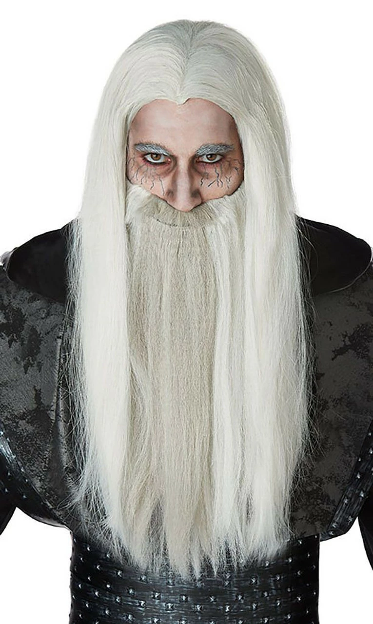 Complete your Dark wizard costume with this long white wig and beard. This wig and beard are perfect for any wizard costume.