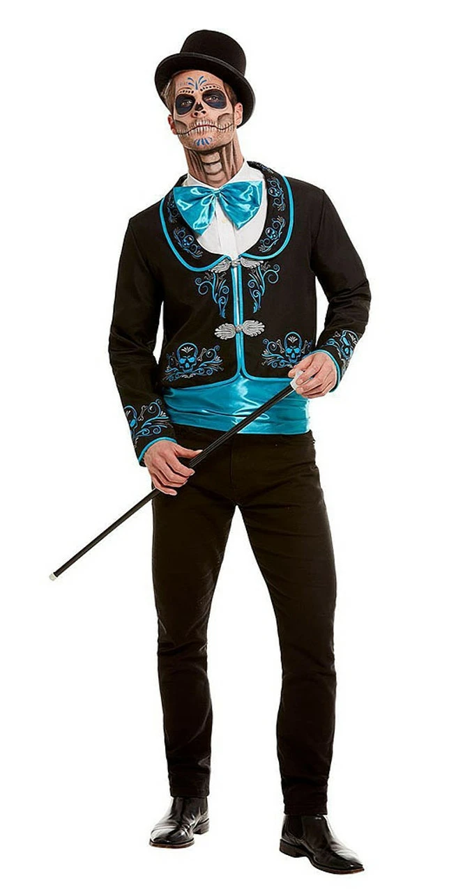 Celebrate the Day of the Dead in style with this stunning Day of the Dead Man Costume! It features a jacket with detailed blue Day of the Dead prints, a cummerbund, and a blue bow tie. Complete the look with Day of the Dead makeup (not included) and you’ll be all set!