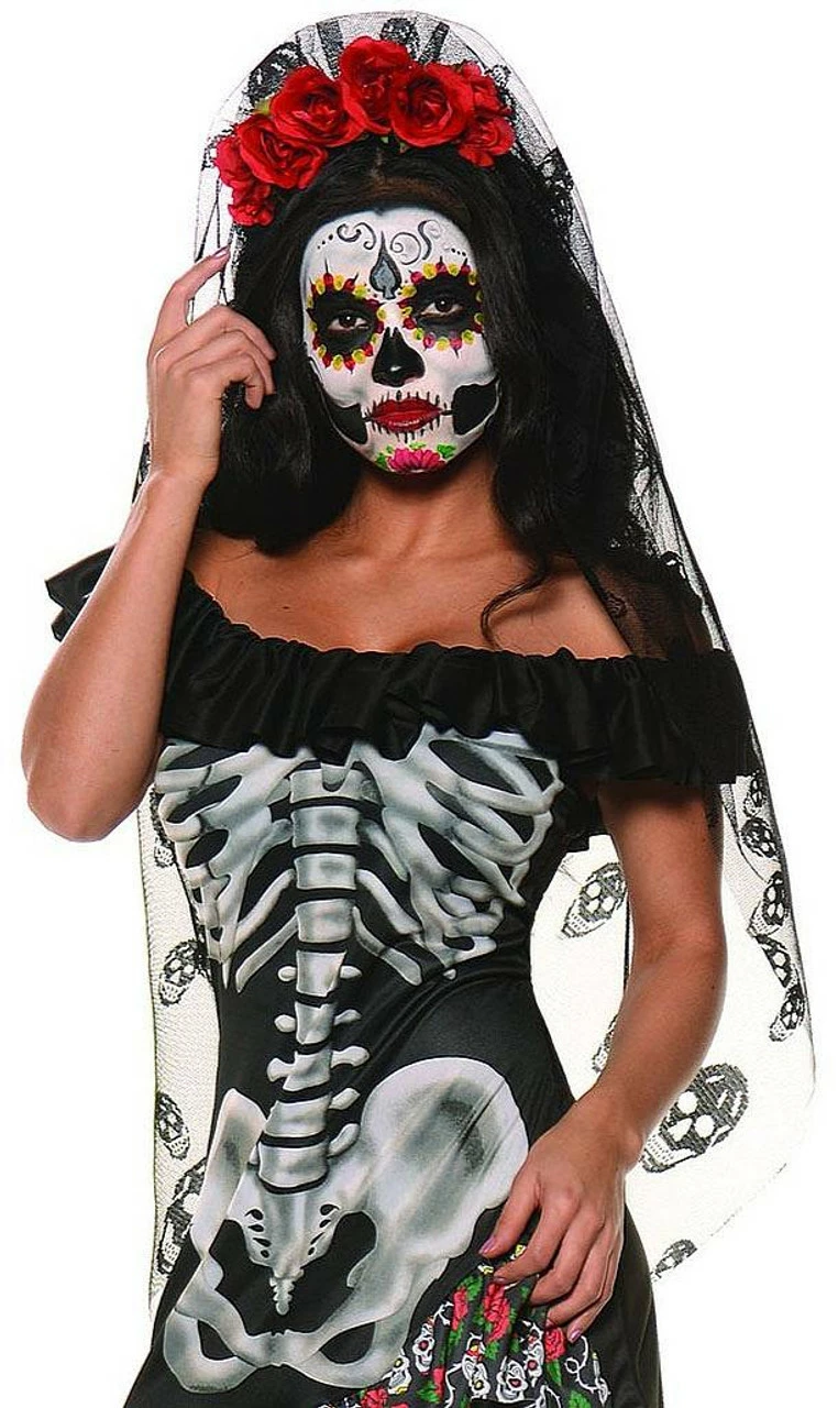 This beautiful Day of the Dead Veil features a headband with attached red roses with a veil covered with small skull designs. It’ll add an extra touch of romance to your Day of the Dead outfit or your cemetery bride!