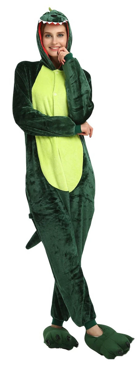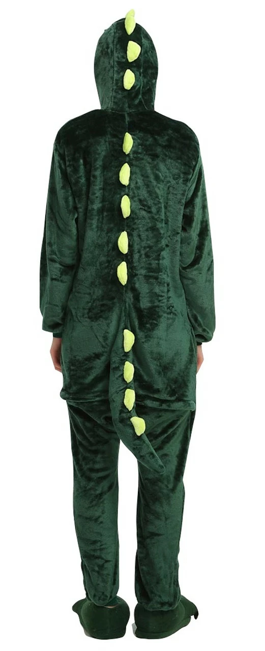 Let the world hear you roar in this soft, comfortable Dinosaur Onesie Adult Costume hooded onesie! This cuddly costume features a dark green dinosaur onesie with a pistachio belly, a plush green tail with pistachio spikes, and a dinosaur hood with a red lining. It also includes a zipper in the back , a butt flap, for conveniences so you can also use it as a cool lounge wear item or pajamas! T