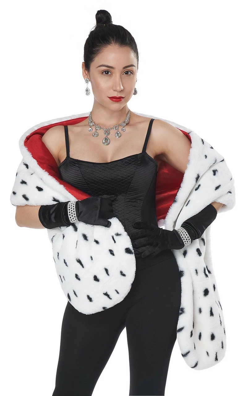 Make your own DIY Cruella Deville Costume with this Faux Dalmatian stole, lined in a dramatic shade of red!