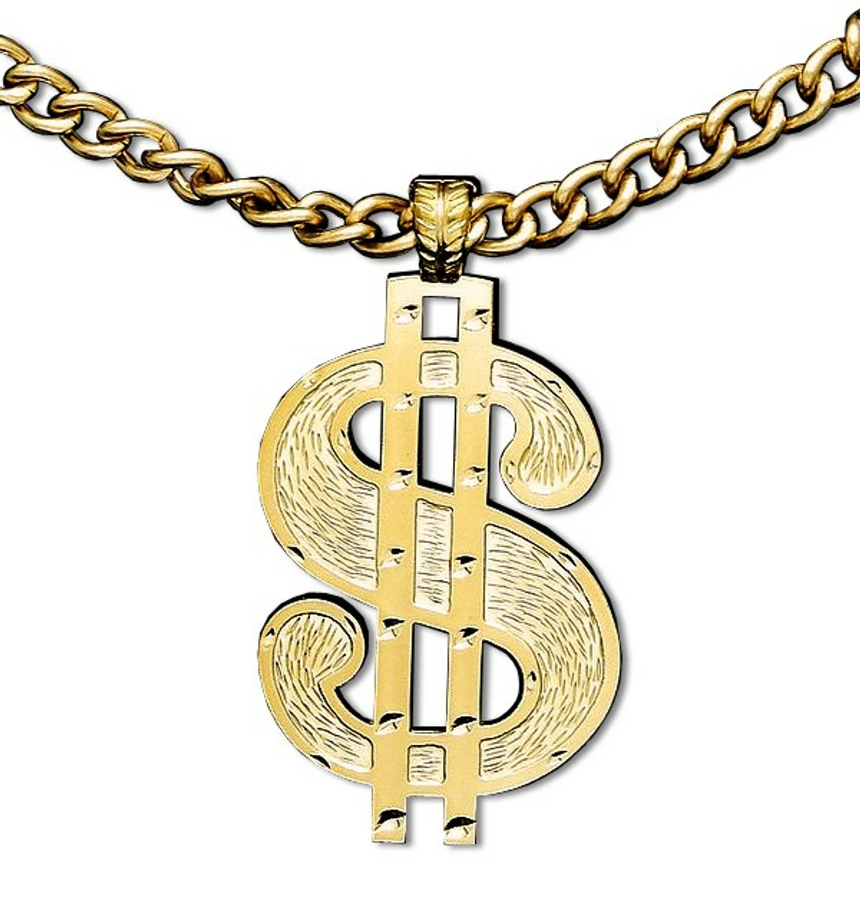 Whether you’re going for a rap sensation or a pimp this Halloween or in a costume party, don’t forget your Dollar Necklace. Wearing this bling keeps a brother’s mind on the money. Show ’em the money boy!