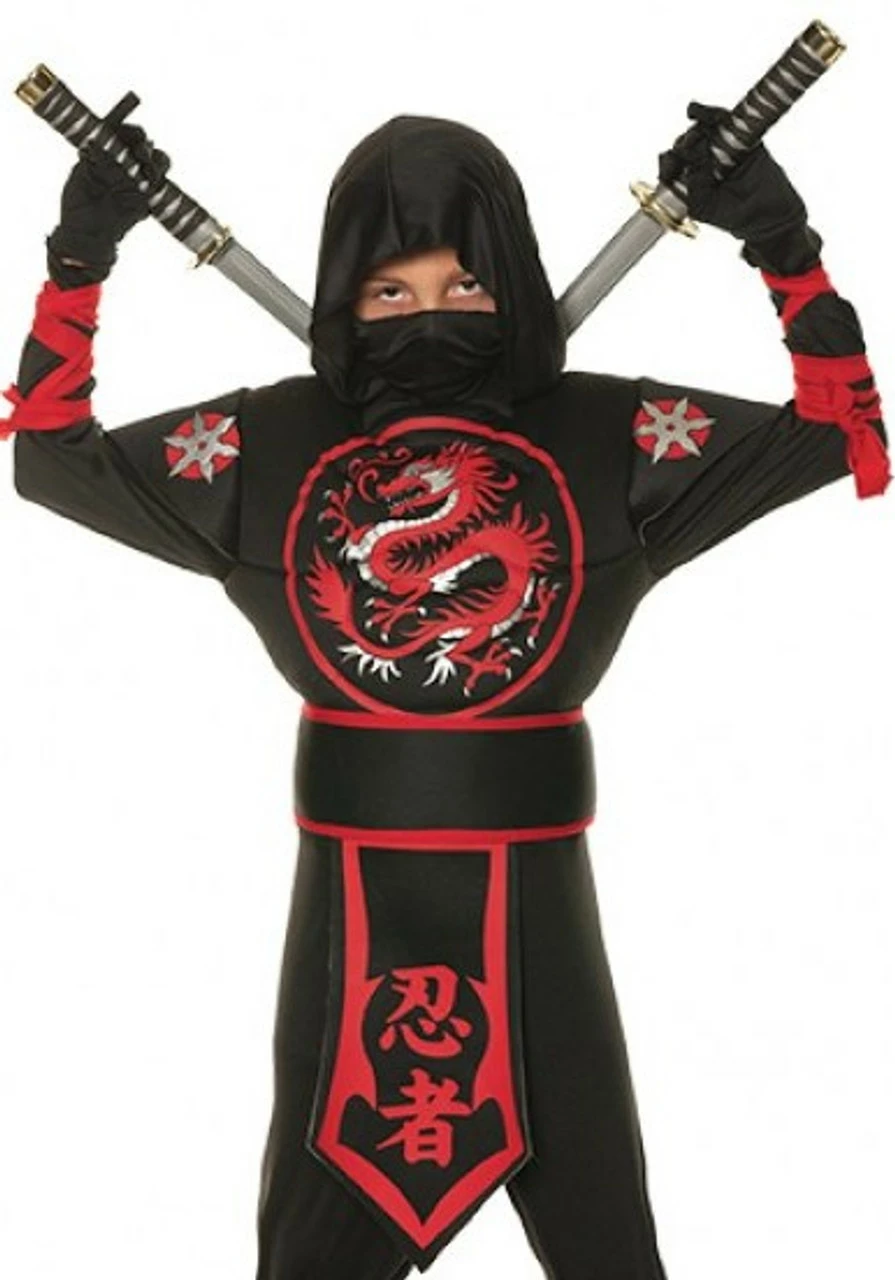 Let your child show off their incredible martial arts skills and fight off evil in this Dragon Ninja Boy Costume ! This outfit features a black tunic with padded muscles and a red dragon logo on the chest, as well as ninja star symbols on the shoulders. This costume also includes black pants with bright red arm and leg wraps, and a screen-printed belt that matches amazingly with the printed tunic. Lastly, this costume comes with a hood and facemask for complete secrecy, don’t forget to add ninja weapons to complete this wonderfully fierce and agile costume!