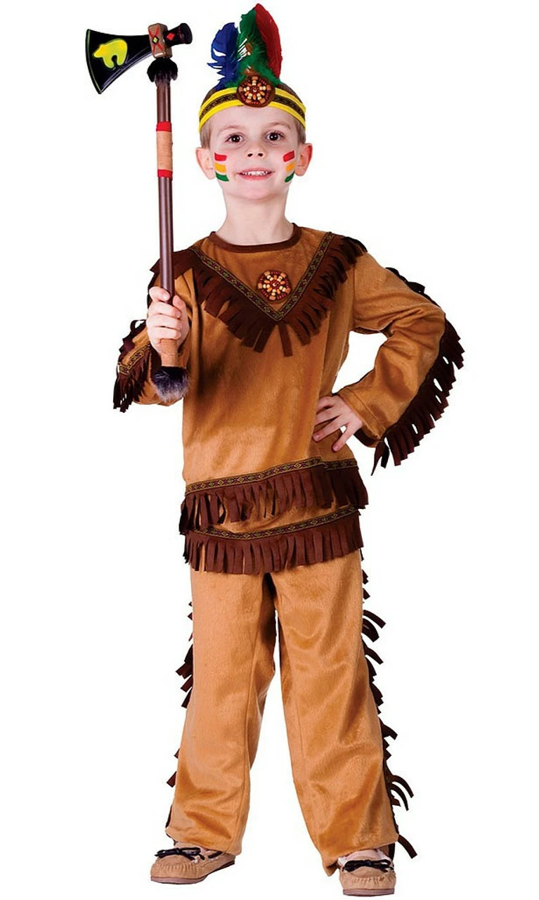 The Early American Warrior Boy outfit features a brown top with long sleeves, beads attached on the front chest, and fringe along the sides, bottom, and chest. It comes with brown pants with fringe on both sides, and a headpiece. Great attire for school play and historical enactment.