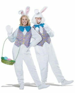 Hop down the bunny trail and race Peter Rabbit delivering the candy decked out in this fun Easter Bunny Adult Costume. This roomy long-sleeve snow white plush jumpsuit features a colorful purple check vest and a festive oversized blue and white bowtie. Opt for either the plush hood or headband with perky bunny ears. Complete you look with the cute bunny nose and create lasting memories during the next egg hunt.