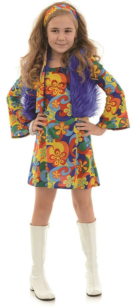 Groovy, girl! This far-out ensemble features retro flower power style straight out of the 1960s. This classic modern mini-dress design features a bright floral print with long, bell-sleeves and a separate psychedelic purple faux fur vest. A matching print scarf-headband completes the look. Peace & love!
