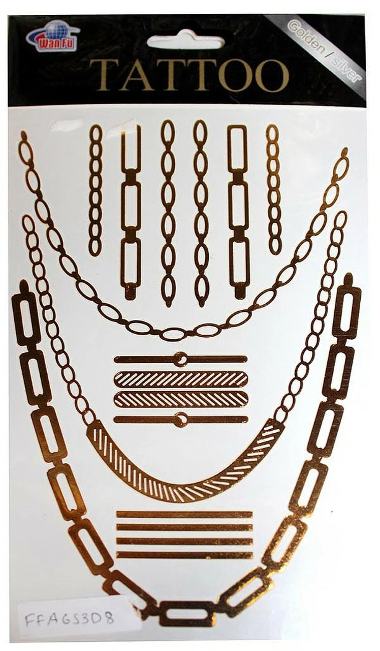 Beautiful Gold Tattoos to use as bracelets or necklaces! Just add water over top and be ready for any music festival or make your Egyptian or Greek costume shine! It features a variety of differently styled chain link necklaces with a variety of pendants you can add to them.
