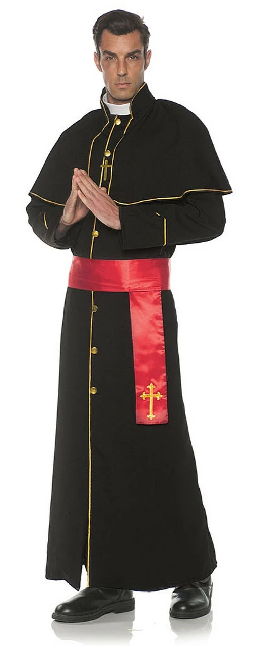 This heavenly costume will make you the star of the party. No need to be pious to wear this beautiful Father Priest Robe! It features a full-length black robe with a gold trim and gold buttons, as well as a red sash embroidered with a gold cross, and a white collar.