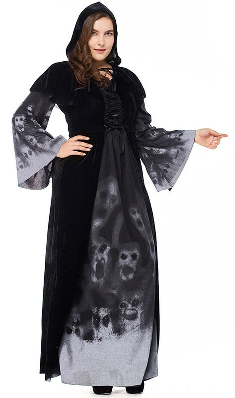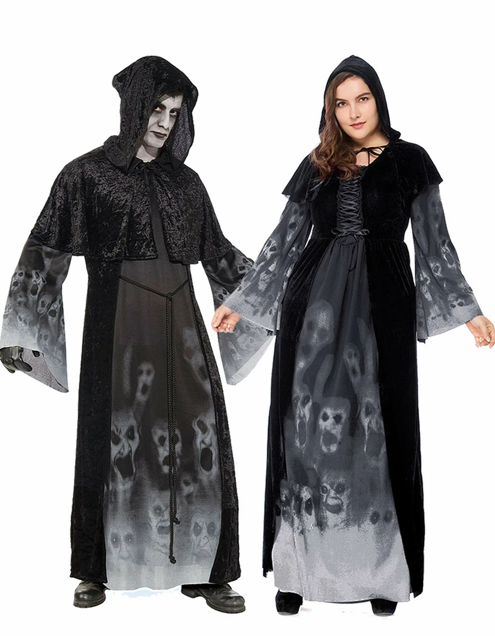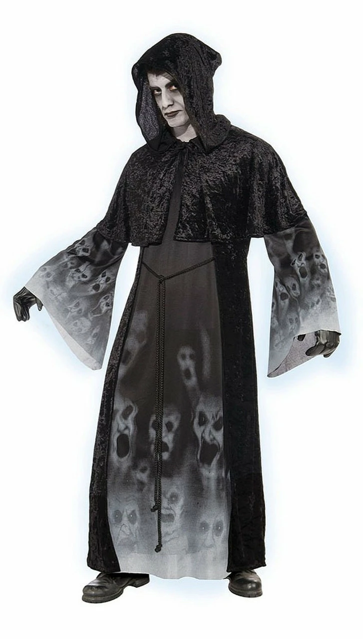 This Halloween, don’t wear the same boring ghost costume as everyone else! You will be scary and original in this Forsaken Souls Couple’s Costume. The costumes are sold separately. The womens costume features a long faux-velour black dress with a laced-up black bodice and a lacy collar, as well as long flared sleeves and a petticoat (attached to the dress) revealing wailing ghosts. The costume also includes a black, silver trimmed hood. The mens costume includes a long black robe with images of sinister, screaming souls in black and white on the bottom of the robe and on the sleeves, as well as a black rope belt attached to the robe, and a black faux-velour capelet with an attached hood.