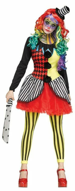 Wear this colourful Freakshow Clown Costume for a Halloween you won’t forget! It features a clown dress with a red skirt with a black-lace trimmed overlay with black and white stripes, red and black checkers on one side of the top, yellow fabric on the other side, and black pompom accents. The dress also features a black-and-blue jagged collar and long black sleeves, and the costume comes with a mini black and white striped top hat, as well as black and yellow striped footless tights.