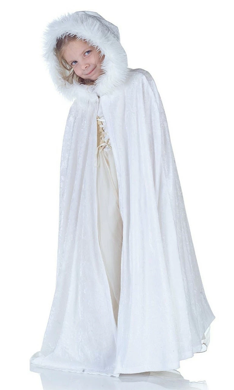 Any princess costume just wouldn’t be complete without this beautiful Frozen White Panne Child Cape with Fur trim. It pure white color is so ravishingly royal looking that it will elevate your costume to the next level! Did we mention that it will make your costume that much warmer? Cause it will.
