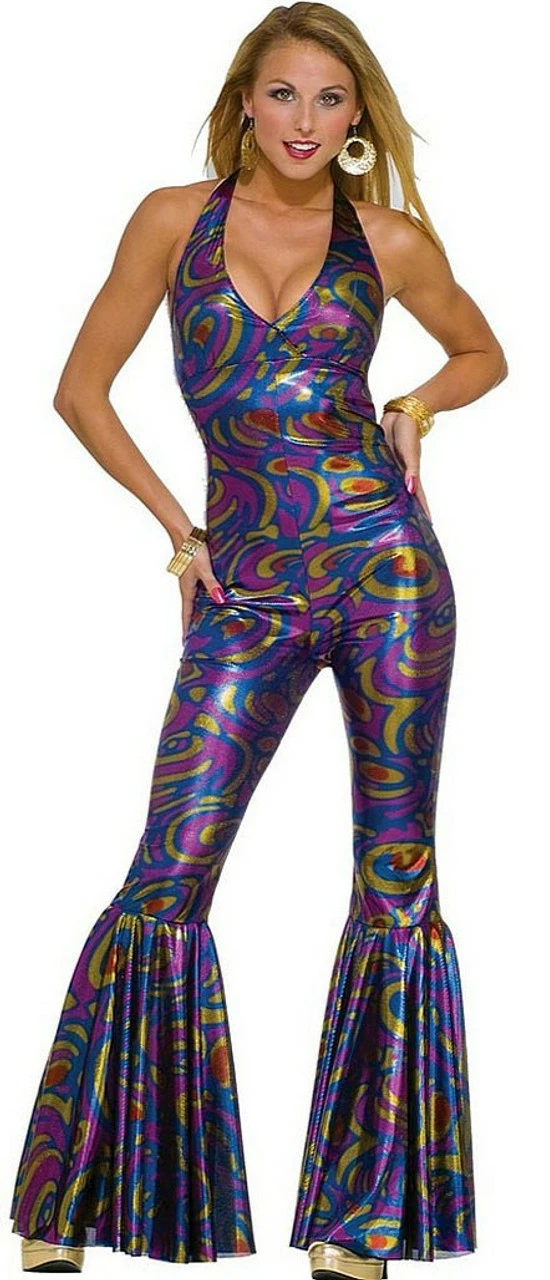 Reign supreme in this Funky Dancin’ Fox costume. This disco costume comes as a one-piece colorful metallic jumpsuit with a halter top and bell bottoms. Feel the heat of disco fever in this Funky Dancin’ Fox costume.