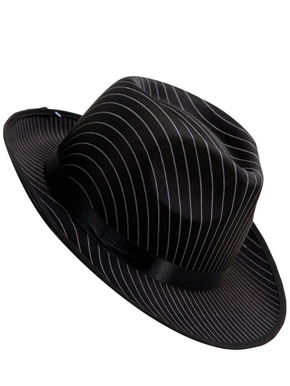 Complete your 1920s Gangster costume with this Gangster Hat With Stripes. This hat features a classic black fedora hat with thin white pin stripes all over. Complete your look with multiple accessories and be ready to show off your style this Halloween.