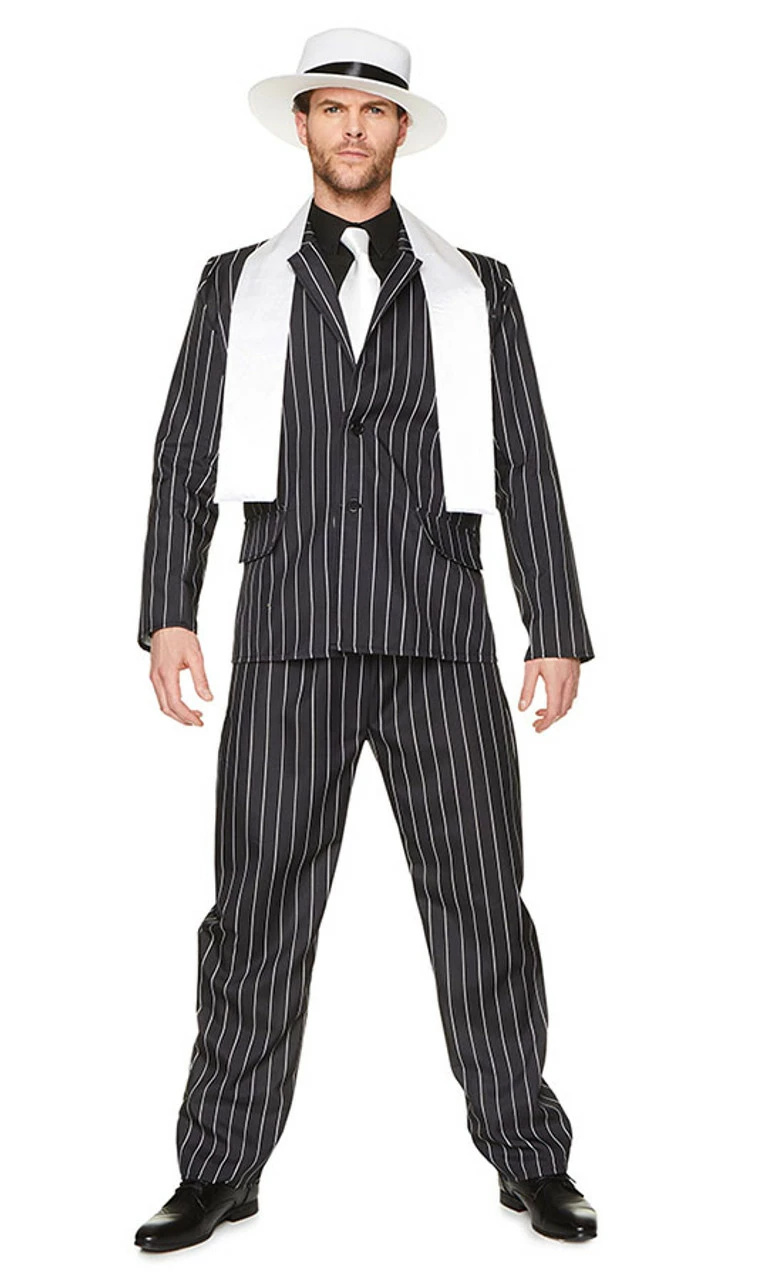 Become your city’s boss of gangsters and the richest of them all in in this Gangster Mob Boss Men Costume! This classic costume features a pinstripe button up jacket with faux pocket details and attached white handkerchief. It includes black and white matching pinstripe trousers with elastic waist and a white satin thick gangster scarf. No gangster costume will be complete without its hat, this one is made from white padded foam with a wire brim edge and black ribbon. This super costume will be perfect for a 20’s themed party or many other events!