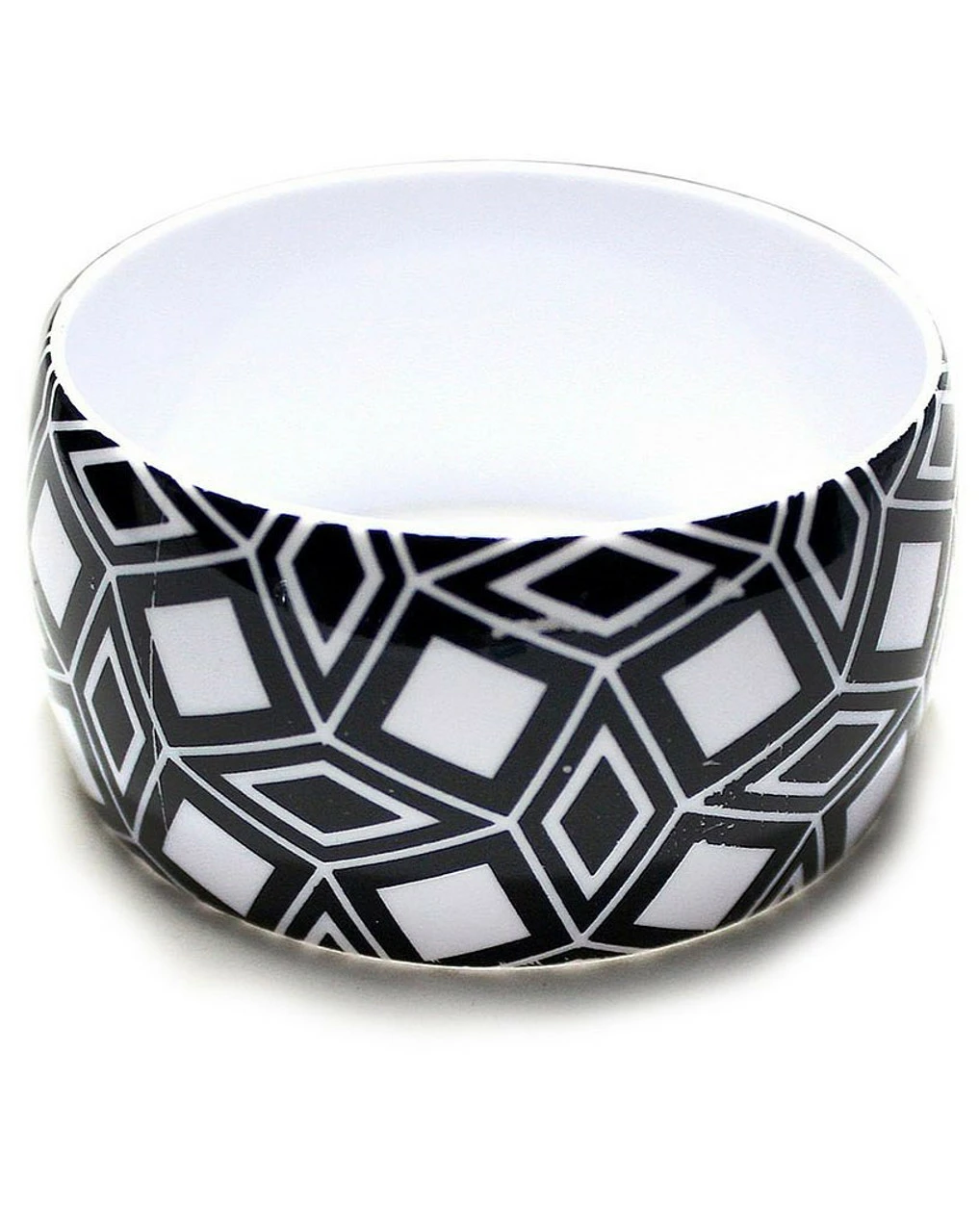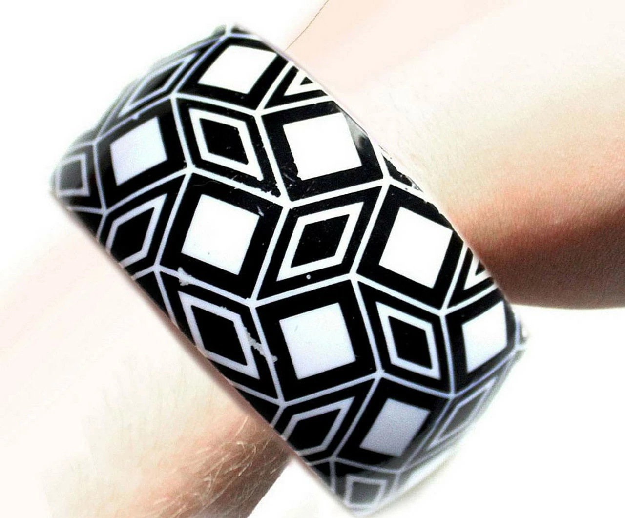 Take your 70s Costume to a new hip level with these Geometric Black & White Bangles! They come in 3 crazy wide designs: Black & White Diamonds, Black & White Stripes and Black & White Squares. Mix and match or go for one design, they’re all great! We also have matching earrings!