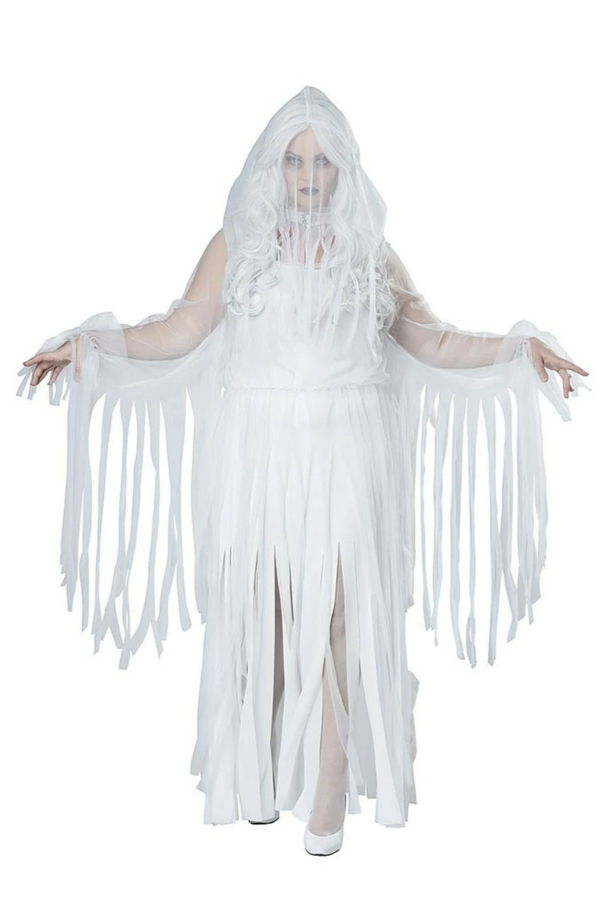 Ghastly, ghoulish, ghostly! No spooky occasion is complete without a haunted appearance by a classic spirit dressed in white. This all-in-one ensemble features a flowing white gown and veiled hood. Sheer fabric flows in tatters from the long sleeves and skirt. A gothic Victorian-style choker with cameo brooch completes this classic bone-chilling look.