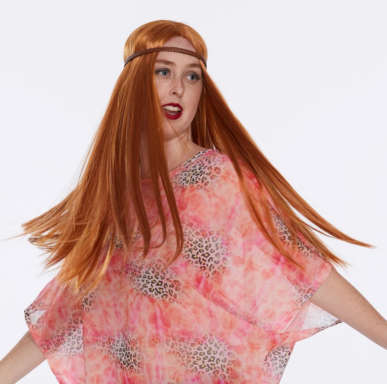 Dazzle and turn heads in this versatile Straight Red Auburn Prestige Wig. It features long and straight ginger-colored hair, parted down the middle. It is a professional quality wig made from heat-friendly synthetic fibers with a breathable inner net with adjustable straps. Perfect for any disco, hippie, flower child costume, mermaid or just for fun with so many outfits.