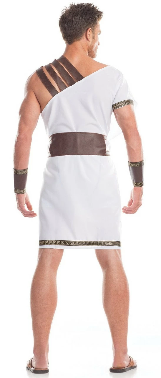 Ave, gladiator! Dress up as a fierce fighter with this Gladiator Men’s costume. This beautiful costume features a short, white, off the shoulder toga with faux leather brown shoulder straps, a matching belt, and matching wristbands. Defeat all your enemies and come out victorious in this stunning costume!