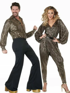Boogie woogie and dance until the dawn under the lights of the disco ball with this 70’s Disco Guy Golden Costume! It features a loose, gold shirt with a large collar and black flared pants. Complete the costume with a wig and chuncky necklaces (not included) for the full Disco look!
