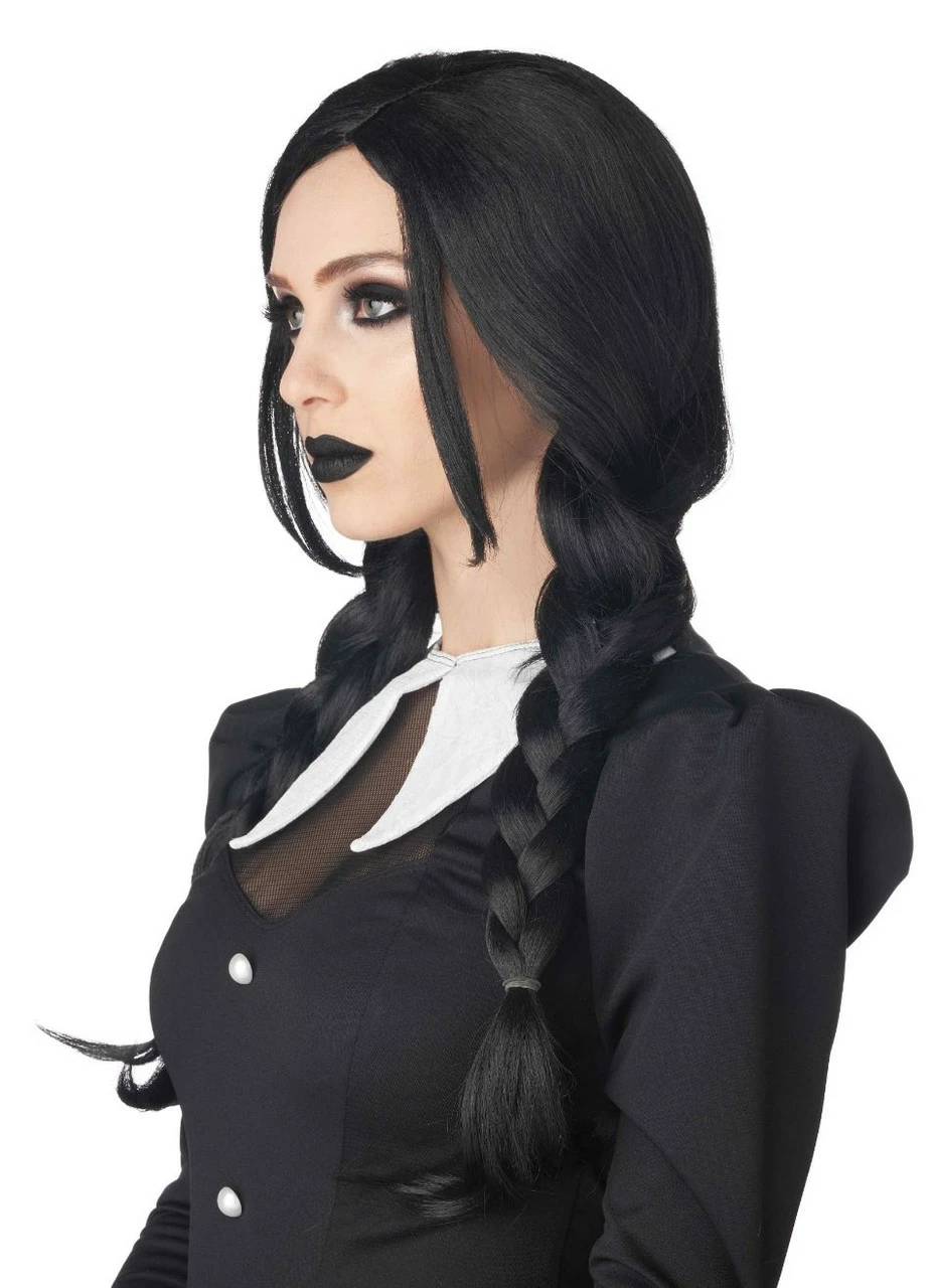 Complete your gothic look or Wednesday Addams costume with the Gothic Wednesday Dark Braids Black Wig. This black wig features two black plaits with almost center parting. We love the face-framing waves on the side for that special look.