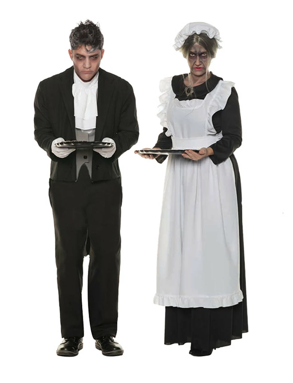 Transform yourself into a scary old Victorian butler and haunt your masters house! The Greeves Butler Men Costume features black tailcoat jacket with attached grey vest with buttons in the center, white ruffled jabot and black pants with elastic waist. Add spooky makeup and scare the hell out of the residents of the house!