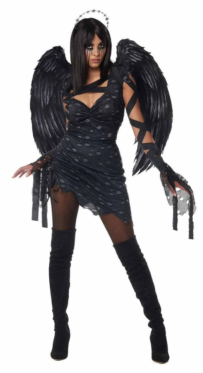Stand out this Halloween by becoming the dark angel in this Angel of Darkness Women Costume! It features a dark gray short sexy sleevelss dress with uneven trims and a ripped black overlay, a beautiful dark silver starry halo, big beautiful feather wings. The matching glovelettes and arm ties add to the dramatic and yet sexy look of this costume. Now you can decide if you want to stay on earth or fly in the skies!