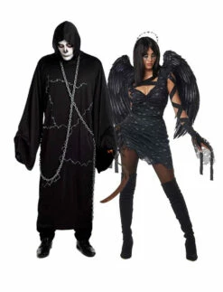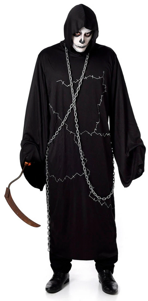 Be the bearer of death in this gruesome Grim Reaper Mens Costume! Bring the terror to the party in this costume consisting of a long black hooded dress with chains to wrap around your body. Add a scythe and some morbid makeup and you’ll be ready to dress up as everyone’s biggest fear – death!
