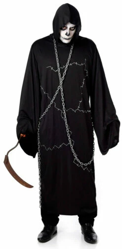 Be the bearer of death in this gruesome Grim Reaper Mens Costume! Bring the terror to the party in this costume consisting of a long black hooded robe with steel wire prints and chains to wrap around your body. Add a scythe and some morbid makeup and you’ll be ready to dress up as everyone’s biggest fear – death!