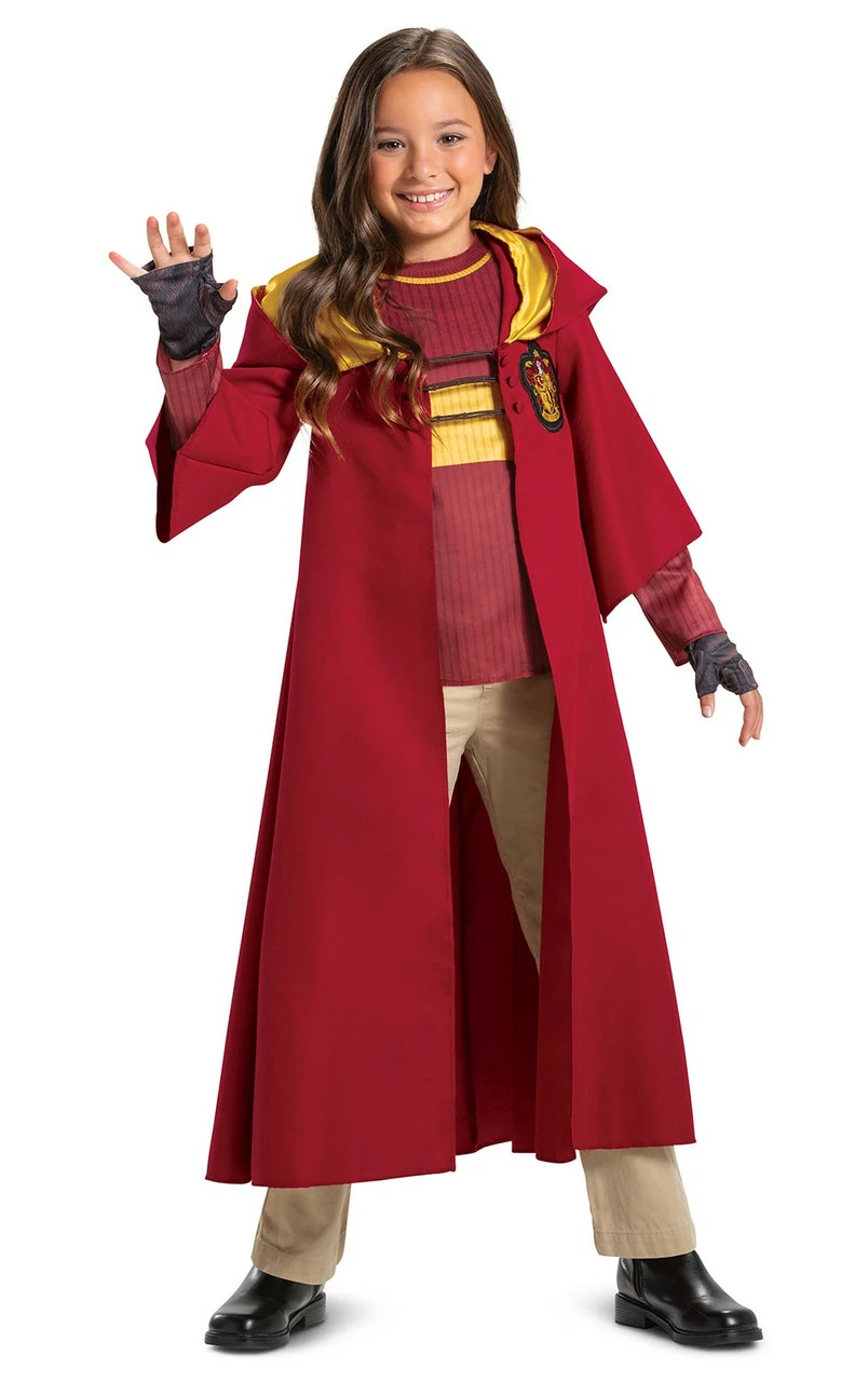 Join the best wizarding sport on flying broomsticks with this Deluxe Quidditch Robe! The officially licensed Harry Potter Quidditch robe features a red robe with an attached hood, yellow lining, front closure, and the Gryffindor crest. The red and yellow stipe top and the fingerless gloves complete the look.