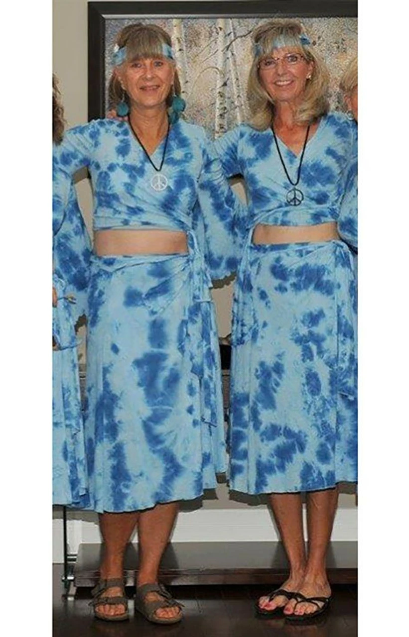 Our Hippie Outfit will have you feeling like the free spirit you were meant to be! The Hippie outfit is made from Tie Dyed material with a bit of stretch to it. The costume features a wrap around top that can be worn high or can fully cover the stomach. The wrap around skirt will display wonderful movement as you walk. A bandana in matching color is included. On Sale Great Value.