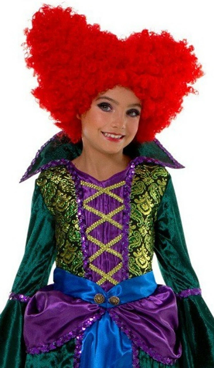 Become one of the Hocus Pocus witches and cast spells this Halloween with this Hocus Pocus inspired Salem Witch Boss Woman Costume for kids! It features a long, witchy dress with green dramatic flared sleeves and a high collar, a laced-up top, and a layered skirt, as well as the character’s iconic bright red wig.