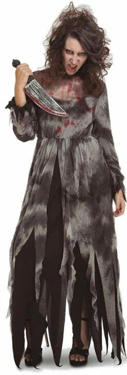Embody everyone’s nightmare with this absolutely terrifying Insane Psycho Woman Costume! Freak out all your friends at the party in this chilling costume, which features a long and lovingly distressed grey and black blood-spattered dress. The edges of the dress are shredded and are layered over black material. This dress is also long-sleeved and has a sweet-heart cut neckline with black mesh on the chest, up to the neck. Add a knife, a messy wig and a bloodthirsty facial expression and scare everyone this Halloween season!