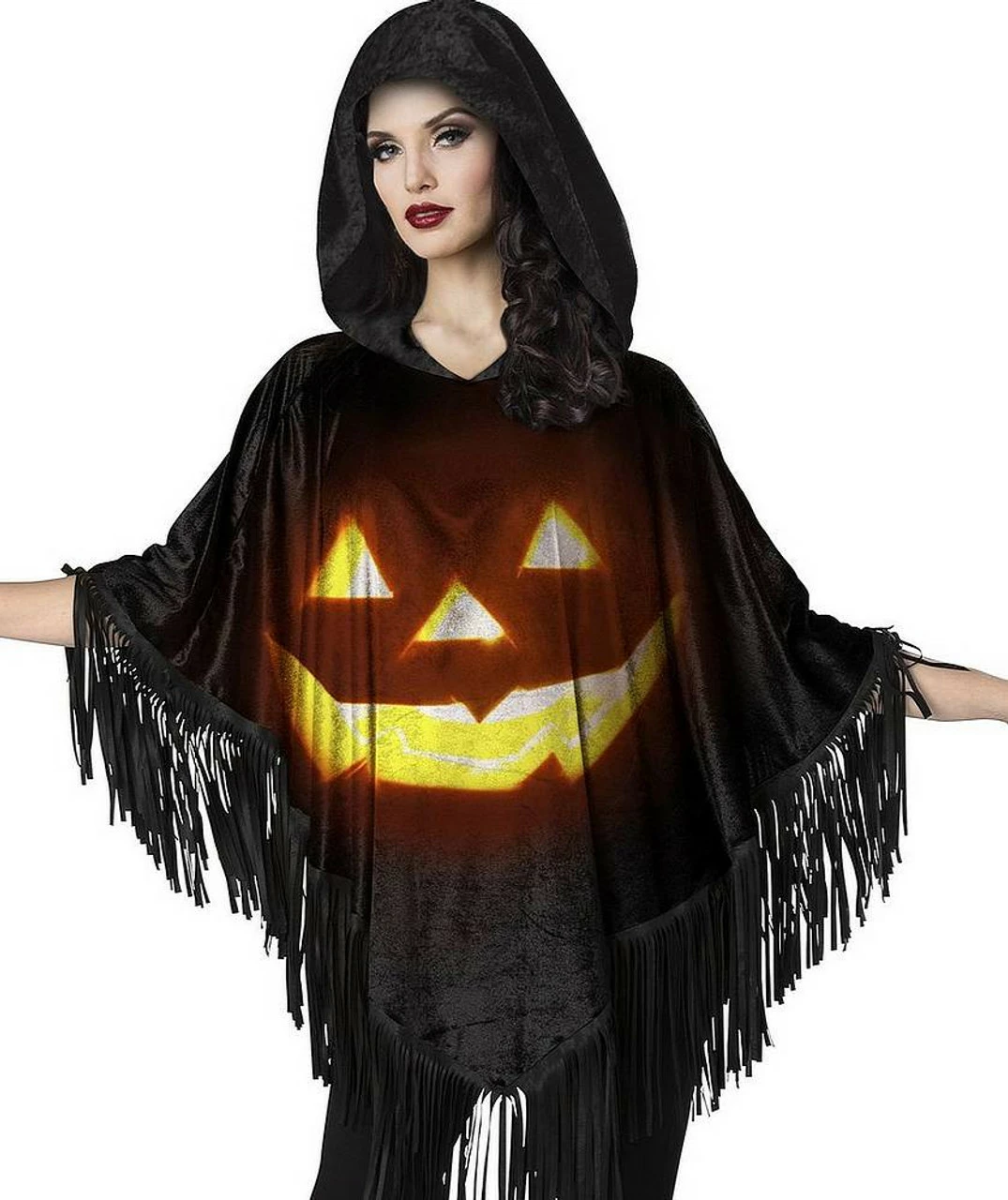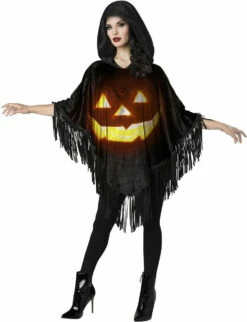 This fun Jack O Lantern poncho is a a quick and easy costume for this Halloween. It features a black a black pull over velveteen poncho with a jack-o-lantern print, an attached hood, and a fringe hem. Now you’re ready to o spice things up!